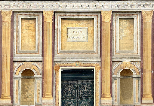 La facciata è particolarissima ed è composta da elementi eclettici appartenenti a epoche diverse. Bellissimo il portone lavorato con motivi ex voto, le vetrate ricurve e la facciata riccamente decorata con capitelli e nicchie trompe-l'-oeil sui toni dell'oro.