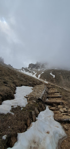 Mas a surpresa veio ao chegar na subida da Forcella Denti di Terrarossa. Foi um grande desafio pessoal. A subida tem cerca de 1 km extremamente íngreme, com muita pedra solta e, no nosso caso, neve também. A trilha é estreita, em vários trechos mal cabem os dois pés lado a lado. Eu tenho medo de altura, então esse trecho foi bem difícil. Não recomendo esse caminho para quem tem medo de altura, pouca experiência em trilha ou está com crianças.