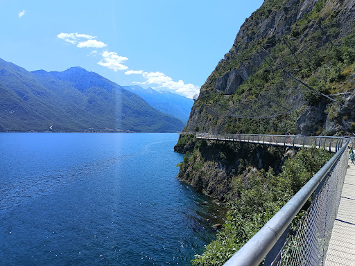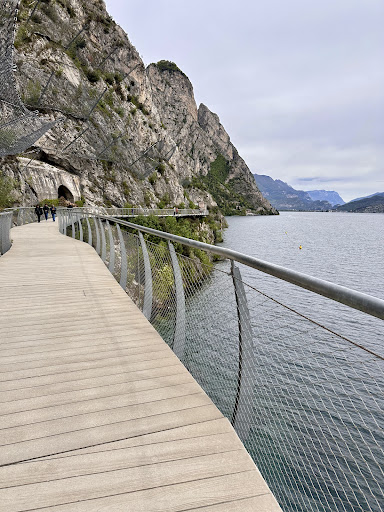 Siamo partiti dal centro di Limone sul Garda e ci siamo diretti verso Riva del Garda. Inizialmente si percorrono le viette del centro su cui si affacciano le case storiche con bellissimi negozi. Successivamente, terminato il centro storico, si attraversa la zona degli alberghi. Tutti offrono ai passanti la possibilità di pranzare, cenare o più semplicemente degustare un long drink sulle loro terrazze panoramiche. I menù sono bene esposti con i prezzi e ce n'è veramente per tutte le tasche. Passati gli hotel inizia il percorso vero e proprio, in mezzo alla natura, a qualche edificio storico, e ci si può fermare presso la spiaggia libera per cani, posto veramente incantevole con spiaggia bianca. Finalmente si arriva alla passerella a picco sul lago. Da questo tratto il panorama è spettacolare. Il percorso finisce al monumento dei caduti sul lavoro per la costruzione della gardesana. Non è un percorso difficile, le salite sono poche e dal centro di Limone al monumento sono circa 6km. Essendo ciclabile e pedonale è un po' troppo trafficato, soprattutto i ciclisti sono costretti a zigzagare spesso. Per chi non vuole camminare troppo si può parcheggiare in zona hotel Eala, sia prima che dopo ci sono dei parcheggi liberi ma con pochi posti ed è zona disco 120 minuti. Oppure c'è il servizio taxi a 12€ (2€ a testa) o l'autobus. Bagni pubblici sempre in zona parcheggi. Dopo gli hotel l'unico ristoro è un track...
