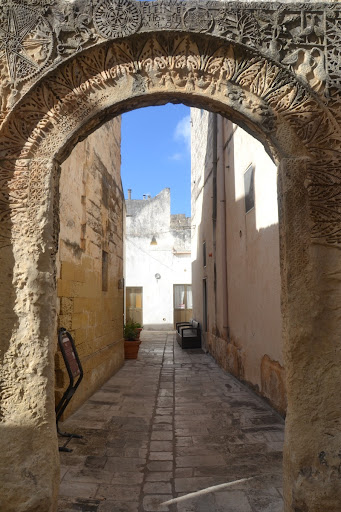 Uno splendido arco in pietra leccese tardo medievale, ricco di rilievi suggestivi, e di simboli da interpretare. Un cane, simbolo di fedeltà, con in bocca un anello si dirige verso un uomo ed una donna che vogliono unirsi in matrimonio che reggono una stella con animaletti fra i raggi. Poi San Michele Arcangelo contro il Drago tenuto al guinzaglio da una principessa. Stessa interpretazione si può avere con le 2 oche, che bevono nella...