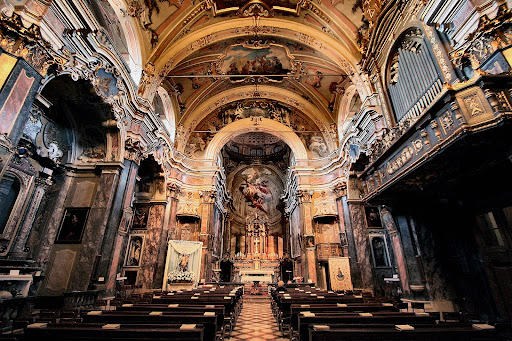 Read moreEdificio provvisto di una doppia facciata risolta in modo ardito sospendendo parzialmente, l' angolo divisorio si articola con supefici curvilinee memori del Roccocò europeo e pertanto originalissime, inusitate in ambito lombardo. Ad un primo ordine schermato da paraste corinzio intervallate da nicchie con triplici modanature subentra un secondo ordine con ampie finestre articolate con un monumentale baldacchino aggettante. A coronamento un frontone convesso completato da decorazioni in altorilievo. L' interno vanta una cupola in prospettiva illusionistica sormontate il presbiterio affine ai fratelli Galliari e ragguardevoli tele di Pompeo Batoni e Callisto Piazza. Pregevole l' organo e l' apparato statuario. Un raro esempio di totale integrazione tra le tre arti fondamentali. Prof. Ermanno Paleari, storico...