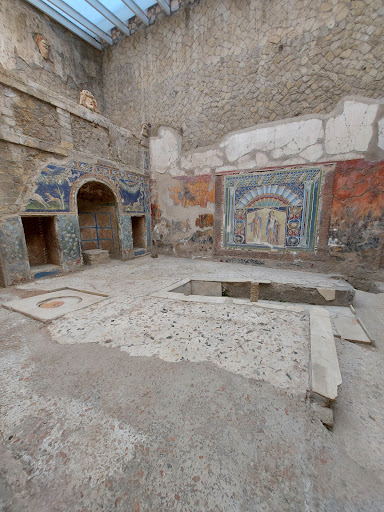 De thermen zijn indrukwekkend in hun detaillering – van de marmeren banken tot de versierde muren – en maken duidelijk hoe verfijnd het dagelijkse leven hier ooit was. In Herculaneum word je niet geleid door de ruïnes, maar door het gevoel dat je zelf door de tijd bent gereisd.
