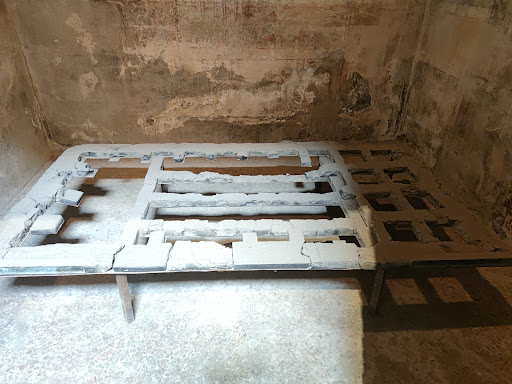 "The House of the Wooden Sacellum owes its name to a beautiful cabinet with a wooden lararium in the shape of a small temple with Corinthian capitals, found charred in a cubicle on the ground floor to the right of the entrance. The domus, albeit with minor transformations that occurred over time, retained until its last phase of life the typical appearance of Herculaneum dwellings of the 2nd century BCE. Proof of this is the plan layout of the rooms with the canonical succession of entrance, fauces, atrium, tablinum. In the atrium, traces of an ancient loggia (cenaculum) are even visible, which must have developed over the tablinum and the rooms facing the V Cardo, according to a model that in Herculaneum is well represented by the Casa Sannitica. Inside the lararium were found, among other things, a statuette of Hercules and a seal of Lucius Autronius Euthimion, the last owner of the domus. Today the house appears bare with few remnants of decorations referable to its last phase of life, but in ancient times it must have had some dignity despite its modest plan development. This is confirmed by the beautiful floor of the tablinum, which shows a cocciopesto decorated with geometric motifs obtained through the insertion of white tesserae, datable between the second and first centuries BC. Just at the entrance to this room, an archaeological essay was carried out that allowed the levels below the cocciopesto floor of the atrium to be investigated, leading to the discovery of a brick and masonry channel, oriented East-West, that was used to convey roof waters into the impluvium basin and from there into the cistern below. It was thus part of the rainwater storage system that served the needs of the inhabitants, who could retrieve it by drawing it through the circular inlet on the south side of the basin: an element that would remain active until the last moment of the building’s life and that bears direct witness to the fact that in this domus, unlike many others in Herculaneum, there was no running water when the eruption of 79 AD arrived.“