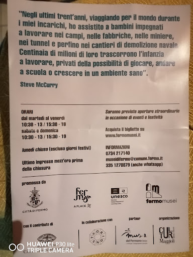 Read moreMostra presso il Palazzo dei Priori sito in Fermo regione Marche Italia, scatti fotografici di Steve Mc Curry Children, dal 20 dicembre 2024 al 4 Maggio 2025, bella ma tanta gente. L'artista ha messo in evidenzia con i suoi scatti fotografici lo sfruttamento minorile nel lavoro , durante i suoi spostamenti ha incontrato tanti bambini che lavorano invece di giocare. Questa è una piaga del nostro mondo, comunque siate pazienti, comprate il biglietto in anticipo, ricordatevi ultimo ingresso mezza ora prima della chiusura, orari, giorni di apertura e contatti riportati nel volantino in foto. Per chi ama la fotografia vale la pena farci un salto molto bella anche perché il tema della mostra è una piaga attuale....