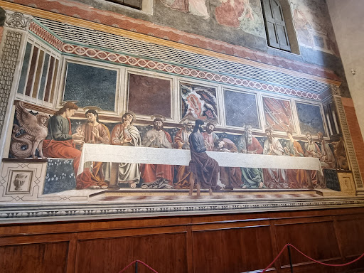 Read moreSo easy to walk by this nunnery which was suppressed (and ignored by Vasari) and miss the Refectory (Cenacolo/Il Refettorio) where Andrea del Castagno filled one wall with his Last Supper. I had wondered about the marbled squares behind the Apostles in framed symmetrical squares. The "Madonna in Shadows" by Fra Angelico in the nearby Dominican church of San Marco, now a museum, holds the key. The painting is an altarpiece with marble predellas. Meditating on the now faded bread and wine is all very well, but apparently one is meant to look for deeper details and symbolism in the marbles themselves. Having that third glass of wine on high days and holy days possibly helped these dear strictly secluded souls contemplate more...
