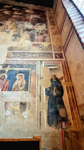 A ticket to the Brancacci Chapel includes entry to the Salvatore Romano Foundation. He was an antique dealer and collector. In 1946 he donated about 70 pieces of his collection to Florence so they could be displayed in the former Refectory of Santo Spirito. He arranged the works himself and the municipal authorities had to agree to respect his wishes in perpetuity that they not be rearranged. He is buried in a sarcophagus in the refectory. No doubt keeping an eye open to ensure nothing is noved... ever. It is somewhat an eclectic mixture and includes a number of column capitals and other broken bits and pieces. The reason we wanted to see the room was due to its original role as a refectory (cenacolo). It has the remnants of a full wall fresco by Andrea di Cione (known as Orcagna), probably in collaboration with his brother, Nardo, executed between 1360 and 1366. Above is a crucifixion and below was the Last Supper. While most of the crucifixion is intact (although quite faded) the Last Supper consists of two apostles and the haloes of two others. The rest of the work was lost when an entrance punched through it to the...