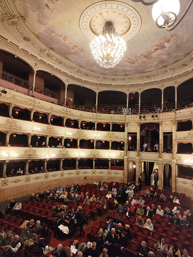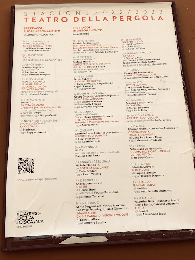 Il Teatro della Pergola, sorto nel 1656, è un piccolo gioello di arte e storia ed è tra i teatri più prestigiosi in Italia. E' il primo esempio di teatro all'italiana, caratterizzato dai palchi, piccoli spazi separati che permettono di assistere agli spettacoli da una posizione privilegiata. Si racconta che la realizzazione dei palchi fosse in realtà stata pensata, più che per migliorare la visione degli spettatori, per evitare spiacevoli attriti tra famiglie fiorentine rivali, note per la proverbiale irascibilità! Addirittura, a supporto di questa ipotesi, all'ingresso del teatro, sono conservati gli stemmi delle famiglie che identificavano la proprietà del palco. La platea ha il caratteristico sistema di sollevamento che permette di portarla all'altezza del palcoscenico per creare un ambiente unico in occasione di grandi feste, mentre nel seminterrato si trova un piccolo museo che, oltre ad accogliere qusto spettacolare meccanismo di sollevamento, conserva preziosi oggetti in mostra. Ho avuto la possibiltà di salire dietro le quinte e di vedere la targa dedicata a Eleonora Duse, donna dalla personalità complessa e moderna, per la quale è stato realizzato accanto al palcoscenico il famoso Primo Camerino: si narra che, per consentire l'ingresso in scena dell'attrice, fosse stato realizzato un "tunnel" di veli per evitare che fosse vista prima di salire in scena. Eh, non si è...