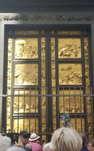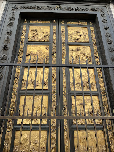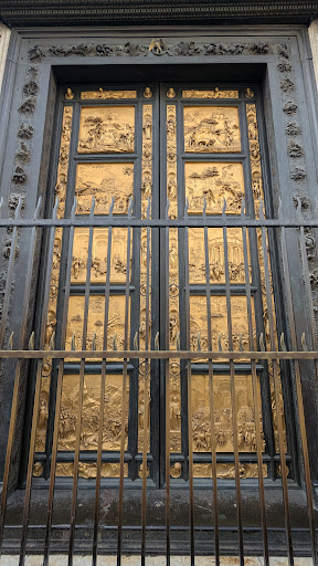 Artistic Features: The panels showcase Ghiberti's mastery of relief sculpture, using a technique called "schiacciato" to create a sense of depth and three-dimensionality. The ten panels include famous biblical scenes such as the Creation of Adam and Eve, the Story of Noah, the Sacrifice of Isaac, and Moses receiving the Ten Commandments. Each panel is surrounded by a framework of smaller figures and medallions, including prophets and sibyls, adding to the intricate design.