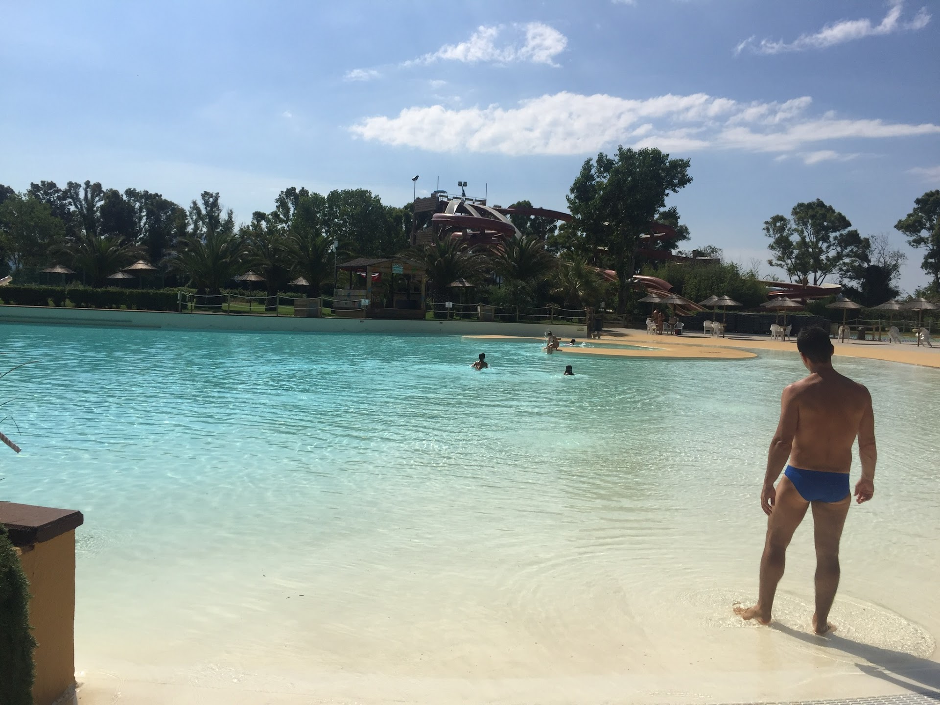 Zuerst: der Park ist tatsächlich eher teuer, für das, was er bietet. Aber: er ist gepflegt und in gutem Zustand für italienische Verhältnisse. Parking: gratis Parking ist schnell voll. Alternativ gedecktes Parking für 3€. Nebst Eintritt bezahlt man 3€ pro Liegestuhl (hat aber Wiesen mit Schatten, wo man auch einfach auf sein Tuch liegen kann) und 3€ für ein Schliessfach (das nur aus Holz ist und daher nicht „safe“). Kulinarisch ist der Park gut: es gibt neben fast food wie Burger, Pommes & Hot dogs auch Pasta, Salat, verschiedene Poke und Früchteteller, die frisch zubereitet werden. Die sanitären Anlagen sind verhältnismässig sauber, es wird regelmässig gereinigt. Im ganzen Park läuft über billige Lautsprecher pausenlos 90er Partysound. Aber in einer Lautstärke, die aushaltbar ist, wenn man mehr als 15m von den Boxen weg ist. Es hat zwei Pools für Kinder. Einer untief für die Kleinen mit Rutsche und Sorinkler, einer mit ca. 90cm Tiefe mit Flussbad usw. Zum Rutschen hat es nur zwei Türme. Einer mit 2 unterschiedlichen Rutschen (1x ab 110cm Grösse, einmal ab 120cm Grösse). Man rutscht immer alleine. Ausser man nutzt die Reifen, die es auch als doppel gibt. Dafür steht man aber ziemlich an. Der zweite Turm hat keine Grössenbegrenzungen und sind nur Einzelrutschen ohne Reifen. Es hat zwei Plattformen mit je 4 Rutschen, die teils identsch sind. Bei unserem Besuch war der Park voll. Anstehzeit pro Rutsche ca. 6-8 Min.