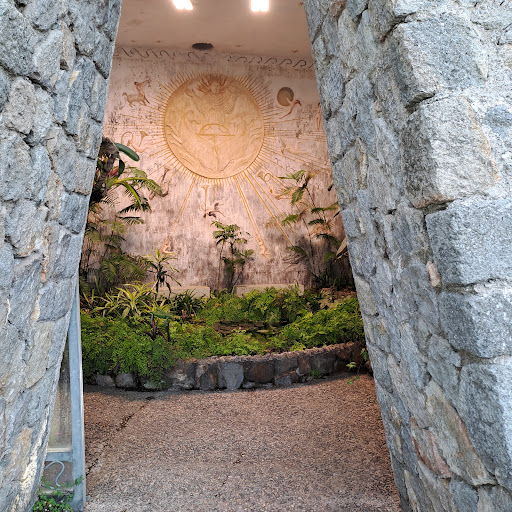 Poco lontano dalla roccia di William si trova l’imponente Tempio del Sole, che domina una scarpata piantata con una collezione di Agavi, Furcraee e palme dal fogliame grigio-azzurro. Il tempio è un'antica cisterna di acqua piovana per l'irrigazione riconvertita. Tre grandi ambienti affiancati si aprono fra pareti spesse un metro e mezzo, illuminati dai raggi di sole che filtrano dalle aperture nel soffitto. La decorazione interna richiama antichi luoghi di culto, grazie alla presenza dell’acqua e dei bassorilievi di ispirazione mitologica, opera di Simon Verity, che illustrano l'affinità di Apollo, il Dio della Musica e della Poesia, con altre arti e scienze, quali la medicina, la danza, la crescita della flora, la natura, le selve antiche, oltre al suo ruolo di indovino e custode dell'Oracolo. Il primo ambiente a sinistra è la STANZA DELLA NASCITA. Qui l'acqua scaturisce da una roccia attraverso le corde dorate della lira di Apollo; in un angolo vediamo Latona, la madre di Apollo che abbraccia una Palma nel momento del travaglio (secondo la leggenda, Apollo nacque all'ombra di una Palma). Più oltre, il dio viene condotto verso l’Olimpo su di un cocchio trainato da cigni. Nella stanza centrale, grande e luminosa, il bassorilievo sulla parete di fondo raffigura Apollo sul carro del sole, i cui raggi dorati si trasformano nella musica di William: PRAISE BE THE LORD OF GOLD ("sia lode al dio dell'oro"), da Belshazzar's Feast su di un lato e sull'altro HOW CAN I SLEEP WHEN LOVE IS WAKING ("come posso dormire quando l'amore si sveglia") da Troilus and Cressida. Nello spazio si librano le nove Muse, alcune figure mitologiche che suonano strumenti musicali e coppie che amoreggiano, una citazione degli affreschi pompeiani. In basso vediamo Apollo e Dafne che, per sfuggire al suo abbraccio, si trasforma in alloro (Laurus nobilis). Questi bassorilievi sono una celebrazione simbolica della vita e del suo trionfo nei piaceri terreni. Nella terza stanza, più buia e raccolta, è rappresentata LA FINE DELLA VITA MORTALE. Qui il corso d’acqua scompare in un vortice, sul quale siede pensierosa la Sibilla Cumana. Una citazione dal VI canto dell'Eneide ricorda il viaggio di Enea nell’oltretomba, che raggiunse grazie alle indicazioni della Sibilla. Due colombe, raffigurate sulla parete di fondo, indicano la pianta da cui Enea dovrà cogliere un ramo dorato per accedere all’Ade: si tratta di un cespuglio di mirto (la Mortella). La Sibilla è anche un simbolo di morte e di rinascita. Secondo alcune leggende, ella era stata destinata a vivere una lunghissima vita, ma fu trasformata in cicala da Apollo per evitarle una...