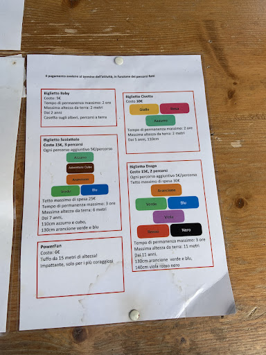 Un bel posto dove trascorrere una giornata con la famiglia o con gli amici. La location è sicuramente suggestiva essendo ai piedi delle Dolomiti, e il personale è molto disponibile e accogliete. Ci sono vari percorsi da poter affrontare ma dipende dall’offerta che si sceglie. Per gli adulti è ce il percorso graduale che parte dall’arancione fino ad arrivare al rosso e nero. L’idea di poter effettuare il percorso successivo solamente se superato il precedente è certamente valida poiché ognuno può valutare le sue capacità e decidere o meno di affrontare il percorso successivo con livello di difficoltà maggiore. Tuttavia, la non possibilità di passare ad esempio direttamente da arancione a viola (vedi foto) è molto limitativa. Per quanto riguarda i prezzi sono accessibili ma la quota fissa per il percorso per adulti (drago) di 15 per poter effettuare solo due percorsi è un po’ eccessiva, soprattutto perché se si vuole proseguire con altri livelli si deve aggiungere, per ciascuno, 5 euro. Nel complesso è un’esperienza che vale la...