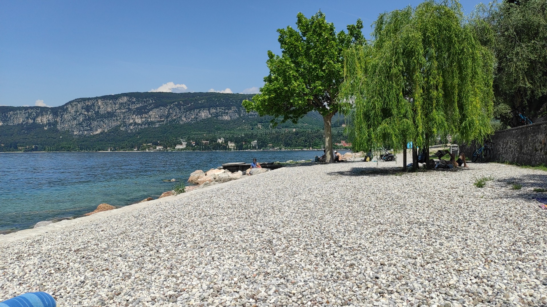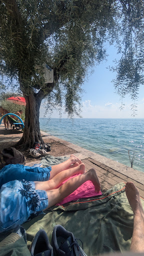 Read moreCiao, più che spiaggia è tipo un terrazzamento, con ghiaia, su cui stendersi con il telo o sul lettino, che si può noleggiare di fronte alla spiaggia. Il parcheggio è nella zona in cui ho fatto il video, è a pagamento, e dopo una certa ora non se ne trova più. Se siete in moto non avete problemi, la parcheggiate dove volete, nei parcheggi appositi o accanto. Il panorama è bellissimo, ci si può tuffare da questo terrazzamento, o scendere piano piano, in acqua prendendo la discesa a lato della spiaggia. Il fondo è tutto ghiaioso sassoso, si scivola solo sulle pietre grosse dentro l'acqua, su cui si trova qualche alga. Consiglio qualche ciabatta o scarpa apposta per i sassi, un po' fastidiosi per le persone più sensibili. L'acqua è pulitissima e trasparente, può darsi che si muovano un po' di onde(secondo me molto divertenti), e smuovano un po' la sabbia sul fondo, ma niente di che, di solito dura pochi minuti. L'acqua è fresca, non da ipotermia, quindi il bagno è d obbligo. Ci sono tante paperelle e cigni in giro, sott'acqua se avete una maschera o degli occhialini si vedono un sacco di pesci(non delle balene, ma dei pesciolini), più ci si spinge a largo più se ne vedono, ma l'acqua diventa profonda subito, se ci si sposta dalla spiaggia. Se andate al mattino trovate la vostra posizione ideale, e il parcheggio, dopodichè si riempe sia il parcheggio vicino che la spiaggia, anche se comunque c'è stato sempre posto durante tutta la giornata(poi c'è gente che se ne va via anche prima, che non rimane la giornata intera, quindi c'è movimento) il bar di fronte ha lettini affittabili(8€), bagni e doccia(bisogna chiedere la chiave). Anche il bar dopo una certa ora si riempe. Consiglio a tutti di farsi...