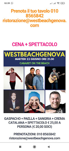 Read morePiù che in spiaggia siamo stati al West Beach per vedere lo spettacolo con i Bruciabaracche, cabarettisti locali. Purtroppo devo dire che la formula cena più spettacolo a 25€ è stata positiva solo a metà, ossia bravissimi i Bruciabaracche a tenere vivo l'interesse fino oltre la mezzanotte (spettacolo iniziato oltre le 22) ma la cena è stata a dir poco mediocre. Il gaspacho così come la sangria sembravano "annacquati", per non parlare della paella che era fortemente speziata e con poco condimento. Si salvava la crema catalana... E che dire di una pizza margherita a 6€ alla quale siamo ricorsi per riempire lo stomaco? Ne abbiamo mangiato di meglio a minor prezzo. Il locale in se non è male, anzi... I camerieri, tutti giovanissimi si sono dati da fare come potevano in mezzo a tante persone da servire... Va beh, tre stelle di...