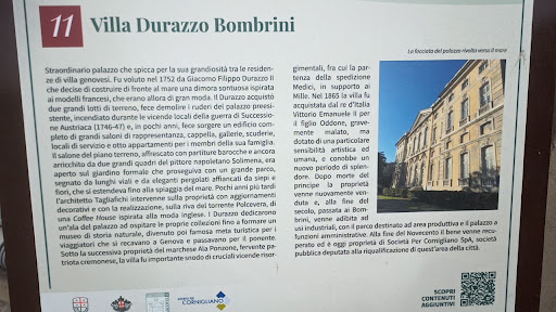 Read moreVilla storica di Cornigliano. Costruita nel 1752 x Giacomo Filippo II Durazzo. Dopo diversi passaggi di proprietà, nel 1865 divenne proprietà della casa reale di Savoia: il re Vittorio Emanuele II la destino' a residenza estiva x il figlio, il principe Oddone che, purtroppo non ebbe modo di goderne le bellezze, dal momento che morì l, anno seguente. La villa venne messa quindi in vendita e fu così che alla fine del secolo ne divenne proprietaria la famiglia Bombrino. Storica sede Ansaldo e Italsider, nel 2008 è di proprietà della società Per Cornigliano Spa formata dalla regione Liguria, dalla città metropolitana, dal comune e da Invitalia Partecipazioni spa in cui è coinvolto il ministero dell'economia. È sede della Genova Liguria Film Commission e del centro x l'impiego...