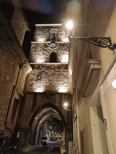 La torre campanaria della Chiesa Cattedrale, comunemente chiamata l'arco di San Pietro, è posta a cavallo dell'asse principale della città e, anticamente, serviva sia la Chiesa di San Pietro che quella di San Paolo, situata all'altro lato della strada, ove ora è la sede dell'Università. La costruzione del campanile risale quasi sicuramente agli anni che seguirono il terremoto del 1349, quando si decise di cambiare l'orientamento della Cattedrale; molti sono i rifacimenti che esso ha subito nel corso degli anni, ma la parte inferiore è sicuramente originale trecentesca su una base del IX secolo: è una torre quadrata di stile gotico con archi a sesto acuto a quattro ordini con alla sommità un orologio. Ai quattro angoli interni dei due archi vi sono quattro statue togate romane provenienti...