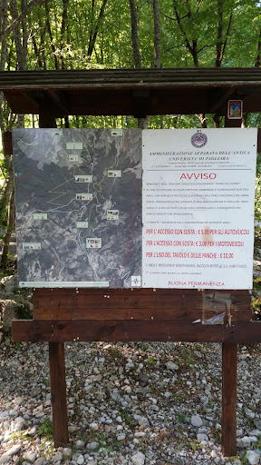 Questo luogo segnalato da pochi cartelli a partire da quello che si trova sulla provinciale ma solo per chi proviene da sud , lo si raggiunge tramite una strada sterrata ma ben percorribile. La stanga di chiusura all'imbocco è presidiata fino ad una certa ora serale da due persone, il che garantisce che non vi siano accessi sconsiderati. Il percorso non lungo è strettino per la verità in alcuni punti ( date un colpo di clacson alle curve cieche per prudenza). Infine si arriva in un bel posto sufficientemente piano e organizzato per accogliere sia camper che tende. Ci sono wc chimici e abbondanti postazioni per cuocere alla griglia. Molti tavoli per Pic Nic. C'è un'area gestita con tavoli per eventuali feste ....ma su questo particolare non ho notizie. Come plus ci sono ben due fontane di acqua corrente freschissima. Ovviamente si paga la sosta e la presenza personale ma con tariffe modeste.