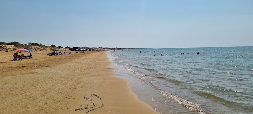 Very empty. Free parking on cross streets and on the shoulder of the road. Free showers. You may have to walk over the dunes depending where you park but paths have been made were the showers are located. No shade, so bring your own. Water is very clean and they had raked the beach. The wind was high at 18 but we put ourselves against the dune and brought rope to stake our umbrella. We set up a distance from the lido and we're entertained by the sail boats and kite surfers. The lido plays loud music so keep this in mind for proximity. A lovely few hours of peace with our own umbrella, folding loungers and pareas and clothes pins to create more shade. Highly recommend this blue flag beach.! We saw many fish jumping out of the water. No trash containers so please pack out everything...