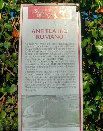 Purtroppo l'anfiteatro è chiuso ..... Da bambino ci andavo a giocare con gli amici e non esistevano cancelli, barriere ... e per colpa di questi ultimi, avrei voluto dare solo un pallino sulla presente recensione ... I resti dell'anfiteatro, furono scavati tra il 1955 e il 1964. Durante il corso di queste campagne di scavo furono portate alla luce, oltre alle strutture murarie, anche tracce di decorazioni, monete, vasellame e resti di statue che ora sono esposti nella sale del museo civico Pier Alessandro Garda di Ivrea. Si tratta di un anfiteatro ellittico con un asse maggiore di 65 metri. Oltre ai resti dei muri perimetrali è ancora presente un cunicolo che consentiva il passaggio diretto di gladiatori e fiere. Alle estremità dell'asse maggiore erano presenti due ingressi per gli spettatori. Il podio era decorato con lastre di bronzo borchiate. Il teatro della colonia romana di Eporedia (l'attuale città di Ivrea) venne costruito a metà del I secolo d.c. nei pressi della strada per Vercelli. Si pensa che potesse ospitare più di diecimila spettatori. Per la sua costruzione dovette essere in parte demolita una villa preesistente, della quale alcune strutture murarie furono inglobate nell'anfiteatro. Purtroppo il teatro è sempre visibile dall'esterno della rete di recinzione dell'area archeologica e la visita dall'interno è possibile solo in particolari momenti dell'anno come le giornate del patrimonio organizzate dal FAI, oppure previo accordo con il comune di Ivrea. Mi auguro che in futuro le cose possano cambiare e si possa trovare una soluzione alternativa, uno straniero che passa da Ivrea non si può permettere d'aspettare le giornate specifiche o cercare di prendere accordi con il Comune...
