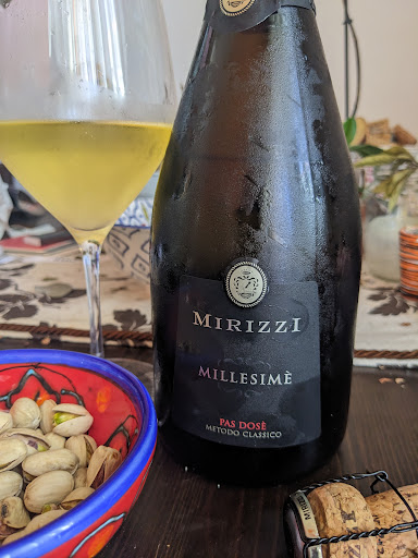 Ho avuto modo di acquistare il "Millesime'" di Mirizzi. Base Verdicchio dei Castelli di Jesi. Vendemmia 2016, sboccatura 2022. Crosta di pane. Una mineralita'sottile si fa strada tra la montagna di lieviti raffinati. Naso riservatissimo: una nota dolce si appoggia alla mineralita'molto trattenuta. In bocca una meraviglia minerale. Le travi minerali resistono al peso di un affinamento da grande Champagne o Metodo Classico. Una soluzione raffinata e tecnicamente impeccabile. Una beva perfetta. Forse un po' autoreferenziale. Come uno Champagne. Ma siamo nel cuore delle Marche dove pulsa il cuore delle passioni. Un po' di calore nell''abbraccio gustativo non sarebbe male rispetto al distacco perfetto del Verdicchio. Se fossimo in una guida, daremmo 96 centesimi....