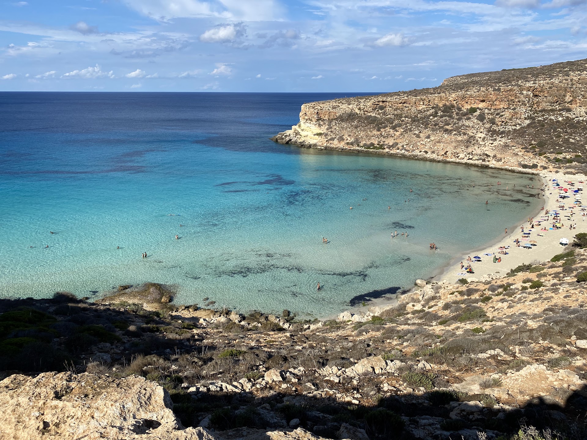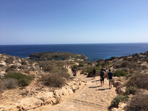 Spiaggia dei conigli visually is like a big open swimming pool: with an incredibly clear water, white sand and fantastic colors. It's super clean and it's important to keep it that way. It's where sea turtles go to lay their eggs and there should be no remains of plastic or dirt (as well to help the little turtles to go to the sea when they are born). There is always a stall from Legambiente, that makes sure that the beach remains clean, but I suggest that, whoever goes there, make an effort to help out the people and the environment. The beach is split in two parts: one where you can bring your umbrella and the other where is not allowed. There is no lifeguard, so pay attention. In front of the beach there is the island of Conigli where is not possible neither to walk, neither to swim around (it's an environment protected area). It takes around 30 min from the top of the cliff to go down. Make sure to bring water with you, after 11 am it gets super hot until 4 pm. The beach closes at 7:30, but the guys from Legambiente will remind you to pack your belongings and start to walk up the hill at 7pm. Anyway, it's an amazing place where to go if you like to swim. I liked to swim along the cliff, from spiaggia dei conigli almost until the "insenatura della tabaccara". Pay attentions to jellyfish if few days before...