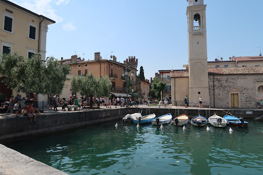 Was für ein schöner Hafen mit all den typisch italienischen Bauten, der Kirche, dem Kontor und der Scaligerfestung im Hintergrund. Hier gibt es einen genialen Eisladen und jede Menge Geschäfte, eine historische Kirche und eine tolle Hafenatmosphäre. Sich hier an die Mole setzen mit einem Eis ist absolut herrlich (Achtung: Schwäne wollen vom Eis auch was abhaben :-). Sie müssen auch unter der Woche mit großen Menschenmassen rechnen, aber der Besuch ist es Wert. Wenn Sie es irgendwie einrichten können, kommen Sie mit dem Schiff, es ist stressarm und umweltfreundlicher - etwas teurer, aber sinnvoll. Abends ist es hier bei Sonnenuntergang sehr romantisch. Was besonders gut gelungen ist: Das Wellenmuster der Bodenpflasterung entlang der Hafenpromenade - das hat eine...