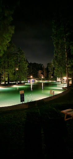 There are two pools of clean spa water nestled within the park. I'd thoroughly recommend the main one tucked into the park and closely surrounded by the trees. Its beautiful natural shape, clean spa water at about 33°C, tiny underwater gravel stones on the bottom make swimming or walking feel very natural and relaxing. It is beautifully illuminated at night (see pic). There is a giant geyser-like jet of cool water and two grotto areas, with colour-changing lights, as well as three pools within the main pool (two at 37°C and one 39°C).