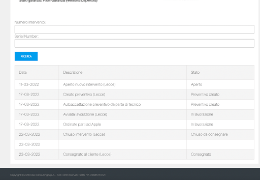 ah però… ma non eravamo in attesa delle parti?! Qui però dice che le parti sono state ordinate il 17 Marzo… quindi senza la mia chiamata sarei invecchiato aspettando?! Avendo capito come sarebbe andata a finire, provo a richiamare il punto vendita il giorno dopo (venerdì 18) e il giorno seguente (sabato 19) ma ovviamente senza ricevere nessuna risposta. Ok, mando una email al servizio clienti C&C, al quale ricevo risposta il lunedì 22 Marzo che in poche parole mi diceva: il pezzo è in arrivo oggi (lunedì 21) entro 24h al massimo 48h riceverai un SMS per andare a prendere il dispositivo. Aspetto il tardo pomeriggio del giorno dopo (martedì 22), e provo a rassicurarmi controllando nuovamente online lo stato della riparazione: nulla di nuovo, tutto fermo. Richiamo il punto vendita ma niente, parlo con l’operatore del centralino che mi risponde, ripetendomi le stesse cose dette per email il giorno prima: il pezzo arriva oggi, 24/48h e ce l’hai… Al che ho perso la pazienza, sentendomi preso per i fondelli e ho detto che sarei andato a riprendermi il dispositivo anche se non riparato, perché stanco di aspettare… risposta dell’operatore: “Guardi l’unica cosa che posso fare è sollecitare il collega”. Ok, chiudo ormai senza nessuna fiducia e speranza. Morale della favola? Dopo poche ore, alle 19.30 di martedì 22 marzo (11 giorni dopo averlo consegnato) dopo giorni di chiamate, email e richieste, arriva il tanto sudato SMS. Capite bene che ora C&C Lecce per me ha la credibilità e l’affidabilità di una carta...