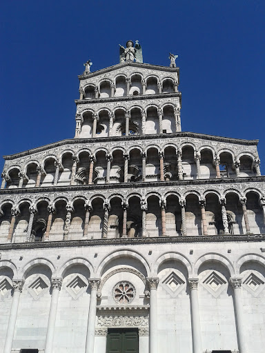 Notable is the façade, from the 13th century, with a large series of sculptures and inlays, numerous of which remade in the 19th century. The lower part has a series of blind arcades, the central of which includes the main portal. The upper part, built using plenty of iron materials to counter wind, has four orders of small loggias. On the summit, flanked by two other angels, is the 4 m-tall statue of St. Michael the Archangel. According to a legend, an angel's finger would have a huge diamond. On the lower right corner of the façade is a statue (1480) of the Madonna salutis portus, sculpted by Matteo Civitali to celebrate the end of the 1476 plague.