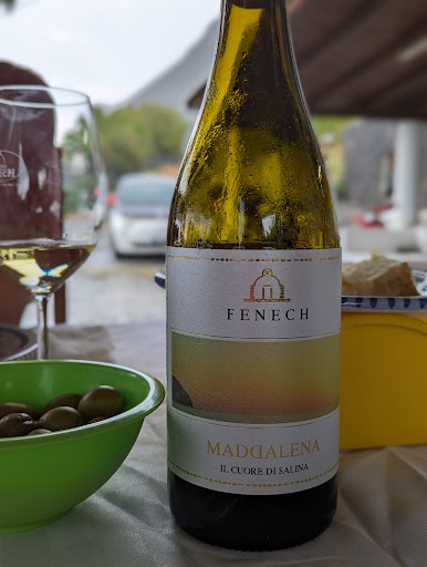 Well, what a whirlwind of an experience, but an amazing one at that! We were looking for in town wine tasting in Malfa, saw Fenech on the map, and decided to give it a go. We got there and noticed a tour in progress, so we stepped to the side so we could ask a question about doing a tasting. Well the heavens opened up and dropped all the rain it had on us. Francesco was kind enough to bring us inside with the tour group. After they finished their questions about the wine making process and the wines in general, they sat down for a multi course meal while the wines were being tasted. Being the amazing host he is, it was insisted that we join. As the rain poured down, we ended up having an amazing time tasting delicious wine, eating delicious homemade food (the focaccia might have been the best and lightest I've had) with local ingredients, and sharing much laughter due to Francesco's story telling and good humor. I highly recommend stopping by Fenech for some wine if you're in Malfa, just be sure to call and make an...