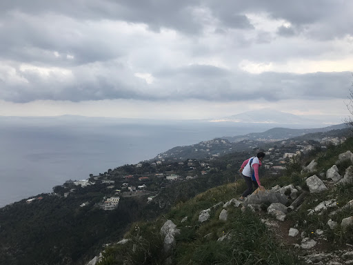A beautiful hike starting from Termini square. On google maps the beginning of this hike is in the Termini Square — not the overlook of Punta Campanella. Parking in March 2019: white lines are 30 min limit - blue parking area st overlook: €0.50 til 1pm; 1-5pm free. This is what we were told from the coffee shop next door. We bought a parking sticker from him since we arrived at 12:30pm. From the lot, walk south towards the split in the road. Right down the hill & right at the split. You’ll see signs. On the trail, there are red lines (&white) on rocks and posts marking the trail.