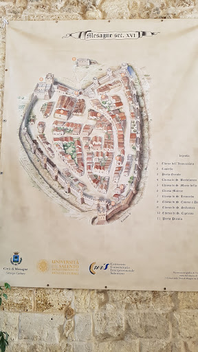 Read morePresumibilmente esisteva già in periodo bizantino (XI secolo), ma la costruzione di un Castrum Medianum è attestata solo nel 1062, anno dell'invasione dei Normanni, a Roberto D'Altavilla. Nel 1195 il castrum di Mesagne è donato ai Cavalieri Teutonici, Durante il Regno di Federico II la manutenzione del castello è affidata esclusivamente agli abitanti del borgo. Intorno al 1430 il castello fu completamente ristrutturato da Giovanni Antonio Orsini del Balzo, al quale si deve la sistemazione del mastio. Ulteriori modifiche furono applicate nel Seicento ad opera di Giovanni Antonio Albricci, principe di Mesagne, e nel 1750 per via dei danni subiti con il terremoto di Nardò del 1743. Sotto il marchese Barretta, quindi, furono abbattuti muri pericolanti, modificate le finestrature del torrione e aperte le arcate al primo piano. A causa del terremoto venne abbattuto il "Polledro", una torretta che sovrastava il mastio. Tra il XVII e il XVIII secolo vi furono ulteriori modifiche apportate dagli Imperiali e dai Granafei, che ne fecero la propria residenza. Dal 1973 il castello è di proprietà del comune, che nel 1995 vi ha svolto lavori di restauro. Al suo interno è allestito il Museo archeologico Ugo Granafei.
