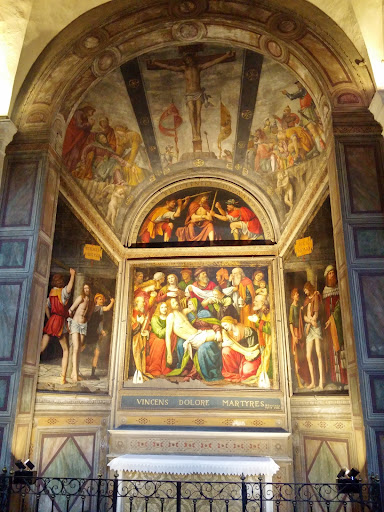 Read moreL'edificio sorse sulle antiche vestigia del palazzo imperiale romano di Milano (da cui il nome) voluto da Diocleziano come sede del tetrarca che avrebbe dovuto governare una delle quattro parti in cui era suddiviso l'Impero romano con Mediolanum capitale. Documenti del 1158 e del 1201 confermano la presenza del Carroccio di Milano, in tempo di pace, nella chiesa di San Giorgio al Palazzo. Un esempio di grande pittura italiana del '600 è rappresentato nella Cappella di San Giorgio a destra entrando. La decorazione della cappella fu commissionata da Luca Terzago, Cancelliere della Confraternita del Santissimo Sacramento, al pittore Bernardino Luini. Il ciclo pittorico venne realizzato e completato nel corso del 1516. L’opera dipinta dal Luini è composta da quattro scene in olio su tavola che raffigurano la Flagellazione, la Coronazione di spine, l’Ecce Homo e il Compianto su Cristo morto. A completamento si aggiunge una volta affrescata che riporta la scena della crocifissione. Punto focale della cappella: il Compianto su Cristo morto. Qui il Luini posiziona ben diciassette persone e ognuna di esse è ben evidenziata nei panneggi delle vesti, nelle espressioni e nei colori vividi...