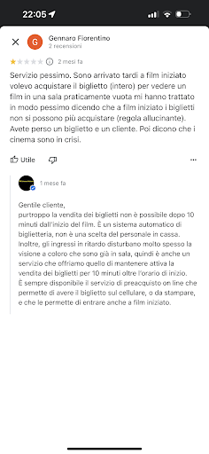 Read moreEsperienza pessima al Cinema Colosseo. Ieri sera, dopo lo spettacolo, la mia compagna ha avuto un calo di pressione. Siamo rientrate per chiedere un po’ d’acqua e l’addetto alla biglietteria (capelli lunghi) ha reagito con un atteggiamento freddo e scortese. Non si è preoccupato minimamente delle condizioni della ragazza, non ha chiesto se servisse un’ambulanza o un aiuto immediato, ma si è mosso con una calma imbarazzante, come se gli stessimo dando fastidio. Dopo minuti interminabili, ha portato l’acqua con un’aria scocciata.