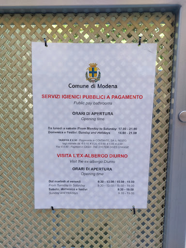 Read moreBella esperienza. È stata recuperata una struttura storica, divisa in zona eventi e bagni pubblici. I servizi igienici sono molto curati e puliti. È possibile depositare in appositi box con codice i propri bagagli gratuitamente e ci sono prese per caricare telefoni e dispositivi elettronici. Considerando la posizione e la riqualificazione del posto c è da fare i complimenti al comune. Unica area di miglioramento: segnalare meglio all’esterno il luogo con apposita comunicazione/cartelli (bisogna scendere una scalinata in piazza Mazzini, l’abbiamo trovato...
