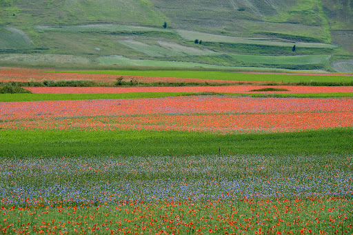 Durante la primavera e l'inizio dell'estate, il Pian Grande si trasforma in un tappeto multicolore grazie alla fioritura delle lenticchie, arricchita da papaveri, fiordalisi e margherite. Questo spettacolo naturale, conosciuto come la "Fioritura di Castelluccio", attira fotografi, botanici e amanti della natura da tutto il mondo.