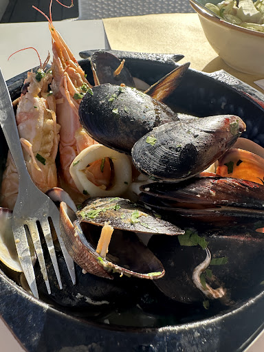 Popped in to get two sunbeds ,been told it will be a while and prompted to wait at table,told us it will be about an hour ,meanwhile we got something to drink and eat ,about 30 min into waiting we could see people showing up asking for sunbeds and being directed straight to them ,at this point we said we will wait for the food ordered and that’s when it got weird ,ordered two salads where we could see the vegetables being not fresh is an understatement and a fish soup that came without any fish in it but with a lot of dead mussels,meaning they weren’t open plus a very funny taste amid the whole thing,meaningless to say we never got the sunbeds but when question the waiter (that spoke with us in english until then )about the soup all of a sudden he didn’t understand english and when questioned about it in Italian he just left,so unfortunately I will have to say this is A...