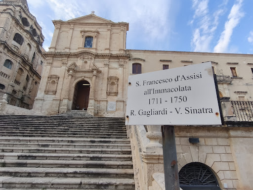 Read moreLuogo incantevolmente accogliente . la Chiesa di san Francesco d'Assisi al'Immacolata (700) si erge in cima ad un'imponente scalinata a tre rampe lungo il Corso Vittorio Emanuele, arteria principale della città, sulla quale si affacciano i principali monumenti civili e religiosi. La Chiesa, con l'annesso ex-convento, è fra i più imponenti edifici religiosi. La magnifica facciata è opera dell'Architetto Rosario Gagliardi, al quale si deve anche l'edificazione del caratteri- stico campanile a forma di pagoda. Le strutture interne sono da attribuire in parte allo stesso Gagliardi e particolarmente all'Architetto Vincenzo Sinatra. Varcato l'ingresso, l'interno ci appare in un'unica ampia navata; si viene come abbraccia- ti dalle forme architettoniche. Lo spazio del vano ecclesiale sembra allargarsi e il respiro farsi più ampio dopo lo sforzo dell'ascesa attraverso l'ampia scalinata, che quale onda che sale porta verso "'Altissimo Bon Signore", si è accolti dallo sguardo materno di Maria Immacolata.