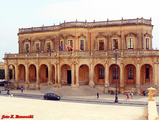 Początki miasta Noto sięgają IX wieku p.n.e., kiedy to założona została tu pierwsza osada. Tragiczną datą w historii miasta był rok 1693, kiedy to trzęsienia ziemi całkowicie zniszczyło miasto. Kolejny wiek to zakrojona na wielką skalę odbudowa od podstaw miasta Noto w nowym barokowym stylu. Nowo powstałe miasto, do którego jako budulec wykorzystano ciepły ciemno- żółty tuf, stało się dużo bardziej okazałe niż przed kataklizmem. Naprzeciwko katedry znajduje się Pałac Ducezio, zamieniony obecnie na siedzibę ratusza miejskiego. Budowę rozpoczęto w 1746, a ukończono w 1830 roku. Górne piętro zostało dobudowane w roku 1950. Budynek jest bardzo efektowny, z półokrągłymi schodami, balkonem z balustradami, łukami i kolumnami. The origins of the city of Noto date back to the ninth century BC, when the first settlement was established here. The tragic date in the history of the city was 1693, when the earthquake completely destroyed the city. The next century is a large-scale reconstruction from the foundations of the city of Noto in a new Baroque style. The newly created city, to which the warm dark yellow tuff was used as a building material, became much more impressive than before the cataclysm. Opposite to cathedral is Ducezio Palace, now converted into the seat of Town Hall. Construction began in 1746 and completed in 1830. The upper floor was added in 1950. The building is very impressive, with semi-circular stairs, a balcony with balustrades, arches...