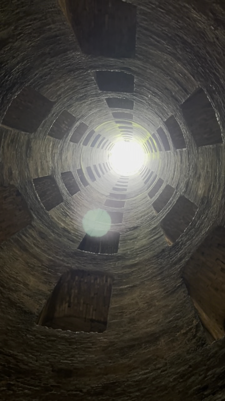 Als ich den Abstieg beginne, umfängt mich ein Gefühl der Stille und Ruhe, aber auch der Ehrfurcht vor den Menschen, die diesen Ort schufen. Die Treppenstufen sind breit genug für einen einfachen Gang, aber die spiralförmige Struktur sorgt dafür, dass die Tiefen immer vor mir verborgen bleiben. Es ist, als tauche ich Schritt für Schritt tiefer in das Geheimnis dieses Ortes ein. Die Steinwände um mich herum sind kühl und feucht, und das Echo meiner Schritte hallt leise wider, als ob der Brunnen selbst mir meine Gegenwart zurückspiegelt.