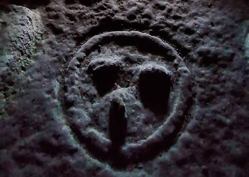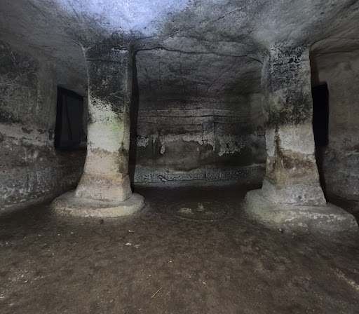 Entrate in una delle domus. La luce fioca del sole penetra attraverso l'ingresso, illuminando le pareti decorate con motivi geometrici, figure animali e simboli religiosi.