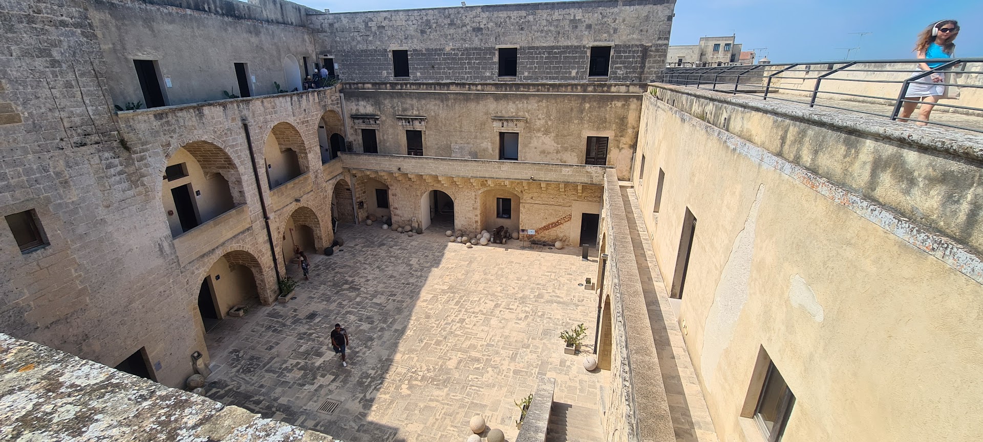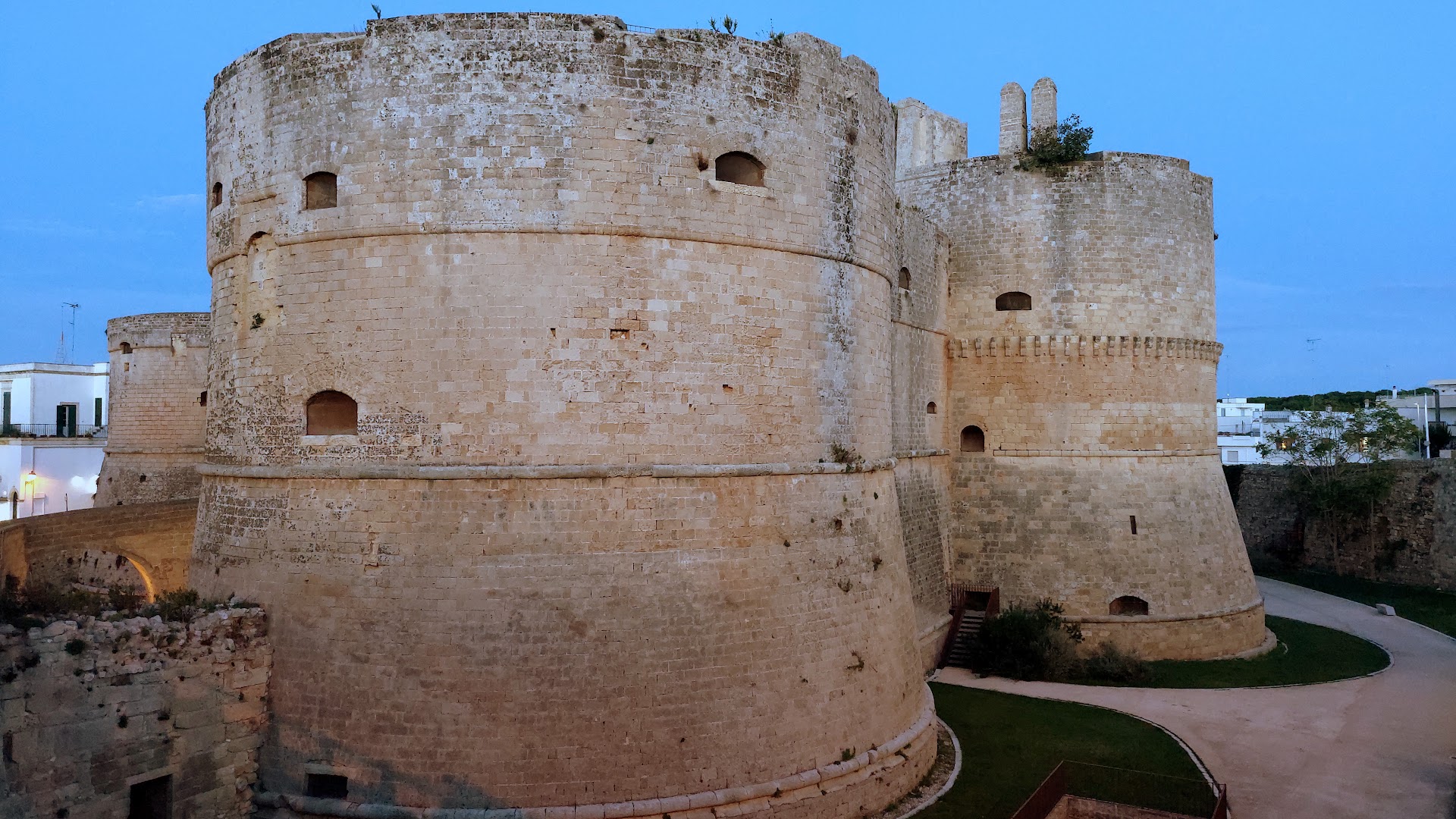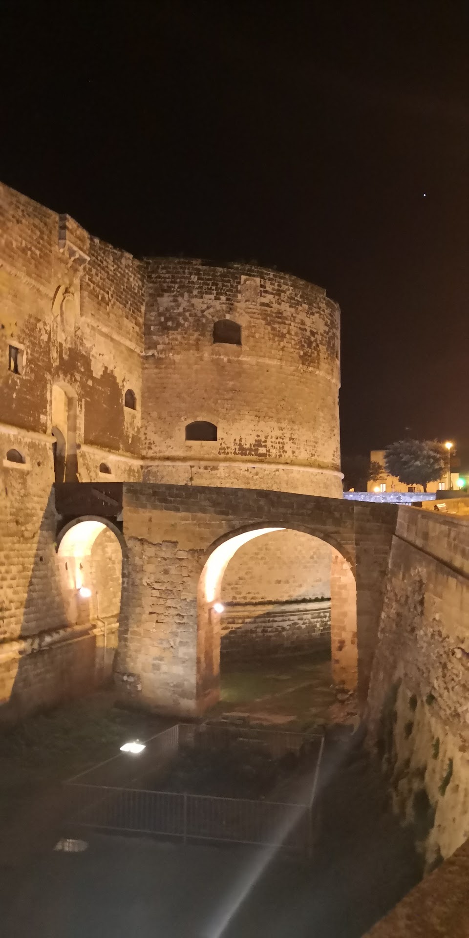 Read moreIl Castello, nella sua configurazione iniziale, di fine '400, si presentava a forma di quadrilatero (trapezio rettangolo) , con ai vertici quattro Rondelle (torri circolari), con quella rivolta verso il mare in posizione più sporgente, come spesso rappresentato nei trattati da Francesco di Giorgio Martini. La configurazione che oggi osserviamo è frutto di costanti modificazioni, che interessarono la fortezza per tutto il '500, imposte dalla continua evoluzione e perfezionamento delle armi da fuoco. E' delimitato su tutti i lati da un profondo fossato che viene superato all'ingresso con un ponte, oggi con arco in pietra e calpestio in legno, probabilmente in origine di tipo levatoio. Un corridoio stretto immette direttamente nell'atrio del piano terra. Attraversandolo si nota l'ispessimento della facciata realizzato agli inizi del '500. Tutti gli ambienti del piano, sviluppati a ridosso delle cortine esterne, a pianta rettangolare o quadrata, si affacciano sul cortile interno e sono coperti da sistemi a volta. All'esterno del quadrilatero originario si sviluppano due ambienti, certamente tra i più rappresentativi dell'intera struttura: le sale triangolare e rettangolare. La sala triangolare fu generata dagli ampliamenti di metà '500, quando fu aggiunto all'esterno il bastione tra le due Rondelle. Particolarmente suggestiva è la copertura a volta di questa sala definita dall'intersezione di tre unghie di padiglione in pietra carparo che seguono la particolare forma in pianta del locale. La Cappella al piano terra si presenta parzialmente affrescata e contiene al suo interno varie cornici ed epigrafi, tra le quali quelle della tomba di Donna Teresa De Azevedo, morta il 23 febbraio del 1707, alla quale il marito, Don Francesco de la Serna e Molina, castellano dell'epoca, dedicò una tenerissima epigrafe in cui la indica quale "esempio di pudicizia, dea di bellezza, modello di onestà, prole di eroi spagnoli" . Al di sotto del piano terra si sviluppa un intrigo di cunicoli, gallerie e piccoli ambienti, che definisce il sistema dei "sotterranei" . Si tratta di ambienti di grande valore storico, molto suggestivi, rimasti immodificati sin dalla loro costruzione, risalente al primo impianto di fine '400. Solo alcuni percorsi hanno subito, con il perfezionamento delle armi da fuoco, nel '500, piccole trasformazioni e ampliamenti. I sotterranei sono il luogo in cui diventa più facile leggere le differenti fasi che hanno caratterizzato la costruzione del Castello: il primo impianto di fine '400, le fodere e i rinforzi delle cortine e di alcune rondelle di inizio '500, l'aggiunta del bastione triangolare di metà '500 e, infine, la realizzazione del puntone verso mare di fine '500. Attraverso una scala in pietra coperta e una scala esterna, sempre in pietra, si può raggiungere il ballatoio del primo piano, che garantisce l'ingresso ad una serie di ambienti che ricalcano in grandi linee posizione e impostazione del piano terra. Da questo livello si accede, però, all'interno delle tre rondelle ancora oggi presenti agli spigoli. Nel cuore delle rondelle, protette da una spessa cortina esterna, sono presenti ambienti a pianta circolare, coperti da cupole emisferiche in pietra carparo, in cui erano collocate bombarde e cannoni orientati verso bocche di fuoco comunicanti con l'esterno. Sulle coperture sono presenti i percorsi di ronda, protetti da muri molto spessi con feritoie per la disposizione di cannoniere. Sia sulle cortine esterne che all'interno dell'atrio sono presenti alcuni stemmi araldici di sovrani e nobili, protagonisti della storia del Castello. Particolarmente interessante quello posto sul portone d'ingresso con lo stemma scolpito dell'Imperatore Carlo V. La fortezza è la location del primo romanzo gotico della storia: Il castello di Otranto, di Horace...