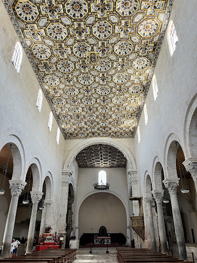 Nascosta tra le viuzze lastricate del centro storico, non lontana dal bastione che sovrasta il porto, sorge la Basilica bizantina di San Pietro, la chiesa più antica di Otranto. Edificata sul punto più elevato di Otranto, tra la fine del IX secolo e inizio del X secolo, costituisce una preziosa testimonianza del dominio bizantino in Terra d'Otranto. La chiesa si presenta con una facciata semplice e lineare, realizzata in conci di calcare con nucleo di malta e pietrisco, sovrastata da una bassa cupola emisferica. Come buona parte delle chiese orientali, l'interno è realizzato con una pianta a croce greca a 3 navate più 3 absidi semicircolari con 12 colonne semi incastrate lungo le pareti e 4 libere al centro che sorreggono una cupola senza tamburo. Il portale è orientato ad ovest, mentre l'unico altare è ad est. Per quando concerne i particolari minori dell'architettura di San Pietro, si nota sopra l'altare al centro della parete un piccolo disco, un foro da dove entrava il primo raggio del sole all'alba, illuminando perpendicolarmente l'interno della chiesa come era tradizione delle antiche chiese elleniche. Interessante è anche il bacino marmoreo che è l'unico elemento dell'arredo liturgico medievale che è rimasto. Decorato con una croce greca incisa, poi apparentemente prolungata in una croce latina, veniva utilizzato per abluzioni o per il lavaggio di oggetti liturgici. Infine la statua di San Pietro, in pietra leccese e smaltata con colori, è del 1635, espressione del barocco leccese. Originariamente la chiesa, al suo interno, si presentava ricca di affreschi bizantini dove alcuni di questi nel corso dei secoli cederanno il posto ad altri affreschi successivi, dando vita a diverse sovrapposizioni, oggi si contano circa 5 strati. Tra gli affreschi bizantini interessanti la "Lavanda dei Piedi" e "L'ultima cena", i più antichi della chiesa datati intorno alla fine del IX secolo, ubicati nella piccola navata di sinistra. Seguono la "Vergogna dopo il Peccato", il "Battesimo", la "Pentecoste", la "Resurrezione di Cristo". Gli affreschi bizantini si alternano con quelli occidentali come la "Pietà", "L'Annunciazione", la "Vergine della Pera con San Nicola di Bari e San Francesco da Paola". Sopra le colonne fanno capolino una serie di Santi realizzati nella seconda metà del 1500 come "San Leonardo", "Santa Lucia", "Santa Apollonia", "Sant'Antonio Abate", "San Francesco da Paola" la "Madonna del latte" ed altri ancora. È presente sull'arcata, sopra l'altare, una decorazione cufica ossia una antica decorazione araba dove pare sia riportata una invocazione ad Allah. In conclusione possiamo definire la Basilica di San Pietro un piccolo contenitore di diverse culture e religioni (bizantina, occidentale ed araba) che convivono pacificamente da diversi secoli, un connubio da prendere come esempio al...