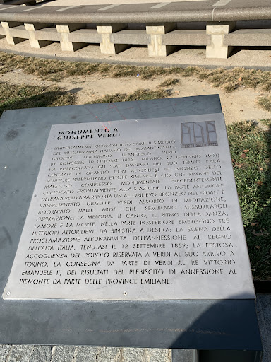 Monumento a Giuseppe Verdi - Universalmente riconosciuto come il simbolo del melodramma italiano del Romanticismo, Giuseppe Fortunino Francesco Verdi (Le Roncole, 10 ottobre 1813 – Milano, 27 gennaio 1901) ha rispecchiato gli stati d’animo del suo tempo. L’ara centrale in granito con altorilievi in bronzo dello scultore palermitano Ettore Ximenes è ciò che rimane del maestoso complesso monumentale precedentemente collocato frontalmente alla stazione. La parte anteriore dell’Ara verdiana riporta un altorilievo bronzeo nel quale è rappresentato Giuseppe Verdi assorto in meditazione, attorniato dalle Muse che sembrano sussurrargli l’Ispirazione, la Melodia, il Canto, il Ritmo della Danza, l’Amore e la Morte. Nella parte posteriore, emergono tre ulteriori altorilievi. Da sinistra e destra: la scena della proclamazione all’unanimità dell’annessione al regno dell’Alta Italia, tenutasi il 12 settembre 1859; la festosa accoglienza del popolo riservata a Verdi al suo arrivo a Torino; la consegna da parte di Verdi al Re Vittorio Emanuele II, dei risultati del Plebiscito di annessione al Piemonte da parte delle...