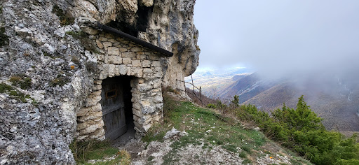 Rifugio davvero molto ben fatto e caratteristico. Ricavato dalla roccia e in parte costruito dall'uomo è un ribugio abbastanza grande dotato di 2 tavoli, panche, ed un bel caminetto funzionante. Ottima la fontanella potabile sull'esterno. Ben isolata termicamente e situata nei pressi di uno strapiombo che offre una visuale mozzafiato. Circa un'oretta di cammino (passo medio) la distanza dal parcheggio auto in paese....