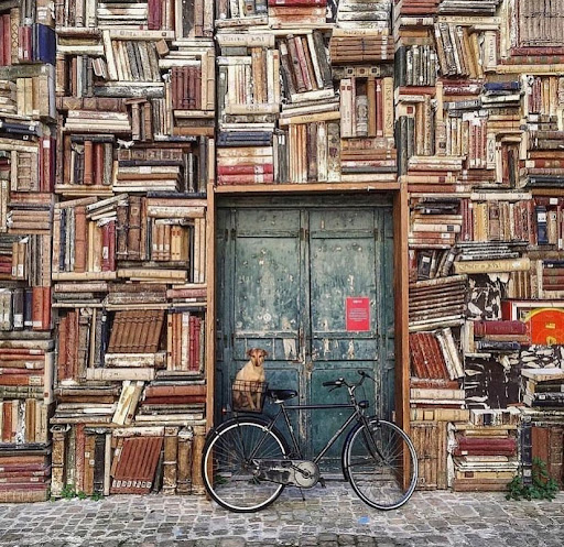 merita un veloce sguardo anche il secondo cortile, dove su una parete è stata collocata la scenografia di uno spettacolo. si tratta di una grande libreria, in polistirolo. molto carina!