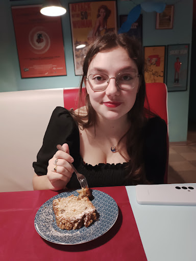 Avevano già apparecchiato per noi, e questo ottimo. Però nonostante ci stessero aspettando la scelta del menù era forse un po' troppo limitata anche in un'ottica fossero arrivati altri clienti, tipo di questi ravioli ne sta 1, gli gnocchi forse conditi così... poi erano anche buoni ma questa limitazione mi metteva un po' acqua alla gola. ad un altro tavolo un simpatico gruppo di vecchietti che vedeva tutti i film metteva allegria. le patate erano un po' troppo farinose, e la scelta del dolce per me astemio che evitavo vinsanto e cantuccini era limitato ad "una specie di fetta di pan bauletto con uvetta e robe" lo ha descritto poco meglio la cameriera che era un pochino confusa quella sera credo. per il prezzo pagato col 50% non mi posso certo lamentare, è stata pure molto gentile, l'atmosfera è carina coi poster del cinema dei tempi andati e persino il bagno con fumetti di Diabolik però ecco scelta cibo limitata a livelli estremi... ci ha portato pane ma...