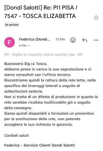 Abbiamo inviato una reclamo formale, ci era stato detto che il divano sarebbe stato ritirato per una perizia. In seguito ci hanno riferito che la macchina per il ritiro era “rotta”, e da allora non rispondono più a email né ai messaggi. Nessun numero di telefono disponibile per contattarli. Passati 2 messi dal invio del reclamo , ancora non sono arrivati a ritirare il divano .