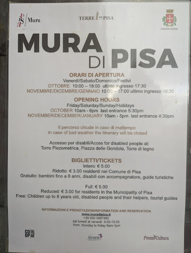 I absolutely loved this. 5€ entrance per person, we entered close to Pisa tower and ended the walk next to the river. We took ca 1.5h at a calm pace with a little break. The walls are well maintained and the walk gives a super nice view of Pisa and all the life that goes on, passing the cathedral and tower, schools, sports fields, university, regular residential areas, some churches and more, while being in peace and a good distance away from the noise if the streets and traffic. Some entrances have a toilet to use (see the map). Keep in mind that there's not many benches or places to rest on the way. We went in off-season during the week and it wasn't crowded at all, maybe saw 10 people during the whole 3km. Some explanations and historical context for the main places is provided, but otherwise the walk itself was the main event. Really enjoyed and...