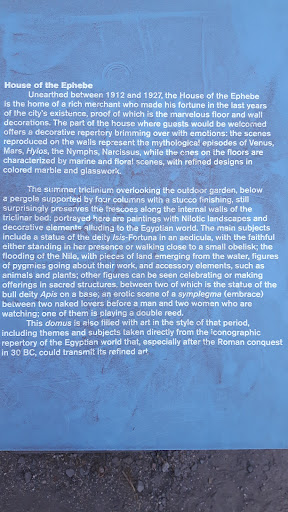 Read moreEs una rica morada de clase mercantil pompeyana. Debe su nombre a una estatua de bronce de un "efebo" hallada junto con objetos. Es el resultado de la unión de varias casas comunicantes y es famosa por la lujosa decoración de paredes y pavimentos. Desta la exedra con valiosas decoraciones musivas con diseños de peces y el triclinio invernal con un magnífico pavimento de mármol de motivos florales con fragmentos de cristal labrado. Las paredes estaban decoradas con cuadraditos que representaban escenas y...