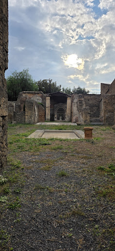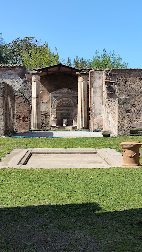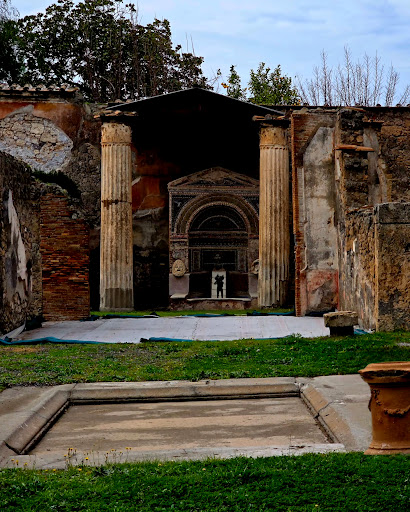 The original structure of the House of the Large Fountain dates to the early 2nd century BC, but it underwent significant modifications during successive building phases. Only in the 1st century AD was the large apse-fountain - which today gives the dwelling its name - constructed against the back wall. It is decorated with mosaics ad shells, and adorned with two marble theatrical masks. At the centre of the fountain lies a cylindrical stand with a central hole, which was devoid of decorative elements when it was discovered between 1826 and 1827. Between the late 1800s and early 1900s, the fountain was modified, by positioning a bronze statue of a putto with a dolphin on the central stand. It was a copy created by the Sommer Foundry of Naples, since the original was found in 1880 in the garden of the House of the Arches (IX 7, 20) and is now kept at the National Archaeological Museum of Naples. The plan proposed here restores the historic arrangement, which was perhaps conceived in a manner similar to the nearby House of the Small Fountain, at the centre of which is a statuette of a putto with a goose, and thus restores the established image of the fountain from the last century. [Tourist...